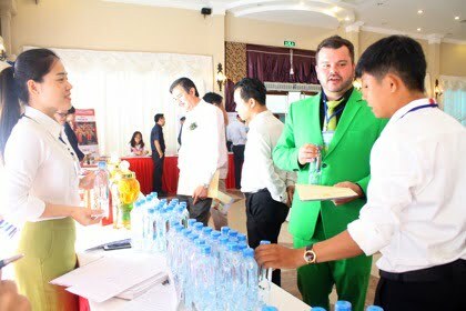 Các doanh nhân tham quan gian trưng bày sản phẩm nước tinh khiết đóng chai của Công ty TNHH Sản xuất và cung cấp nước đóng chai Vie (TP.Vũng Tàu).
