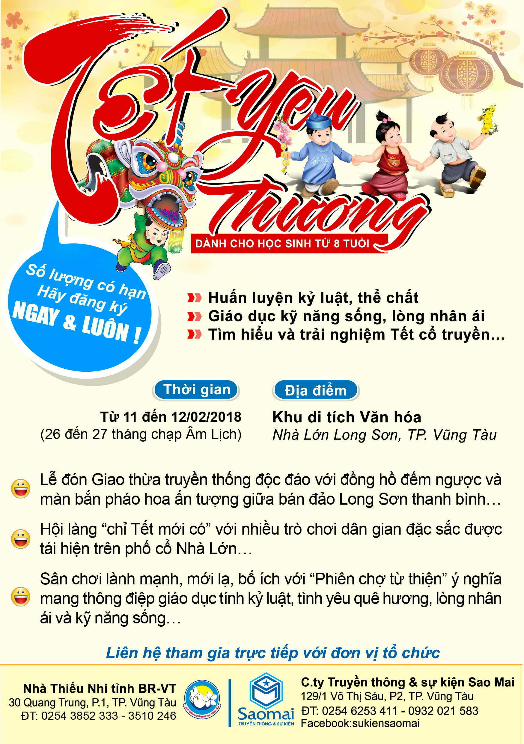 Nối tiếp thành công “Tết Yêu Thương năm 2017”, nhân dịp học sinh được nghỉ Tết Nguyên đán Mậu Tuất sắp tới, trong 02 ngày từ 11 đến 12/02/2018 (tức 26 đến 27 tháng chạp), tại Khu di tích Văn hóa Nhà Lớn Long Sơn, Nhà Thiếu Nhi tỉnh Bà Rịa – Vũng Tàu phối hợp cùng Công ty Truyền thông & sự kiện Sao Mai (Sao Mai Media) tổ chức chương trình “Tết Yêu Thương lần II – năm 2018” dành cho thiếu nhi từ 8 tuổi theo hình thức: cắm trại dã ngoại, sinh hoạt cộng đồng, du khảo điền dã, gặp gỡ giao lưu…